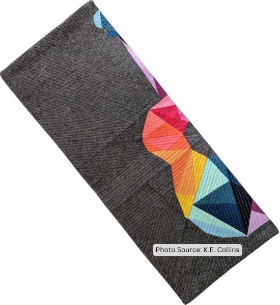This musical quilt runner combines a textured guitar appliqué with sharp geometric patterns and a bold piano key design.