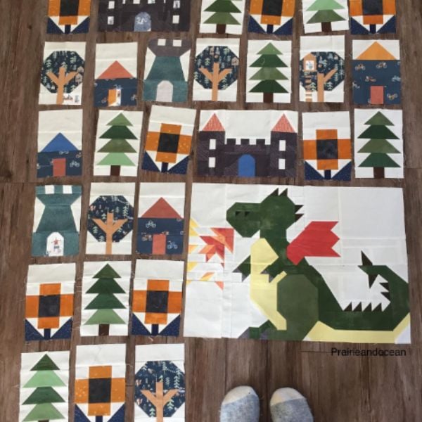 A magical dragon-themed quilt in the making, featuring cute house and tree blocks alongside a fierce dragon ready to light up a little one’s space.