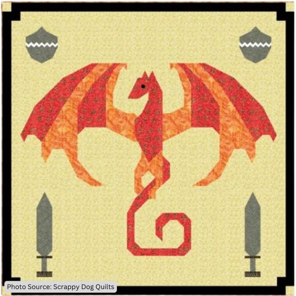 Bring a fiery flair to your quilting with the Fantasy Dragon Quilt Pattern by Misty of Scrappy Dog Quilts. This design features a majestic dragon in striking detail, complete with wings, tail, and medieval-themed accents like shields and swords.